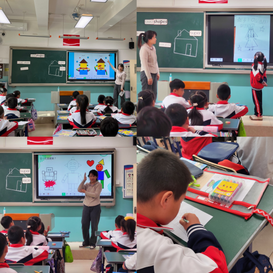 路慧老师进行快乐英语第二单元《Let's sing》的授课。面对二年级的学生,路老师语调亲切,运用多种多样的多媒体形式,充分调动学生的积极性,使他们参与到课堂当中,成为本节课的小主人。学生在与路老师带来的新朋友Mr Head交流的过程中,复习了有关形状的新单词,还学习了一首新的小歌谣。在路老师一步一步的引导下,学生们不仅学会了这首歌谣,还通过自己动手画画,改编出了属于自己画作的个性化歌谣,提高了英语语言运用能力;同时,在对他人画作进行评判的过程中,学生们还意识到了每个人都有自己的长处,我们在生活和学习中都应取长补短的道理。