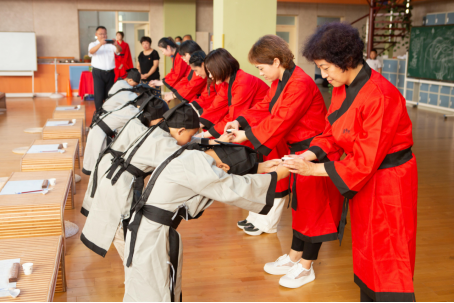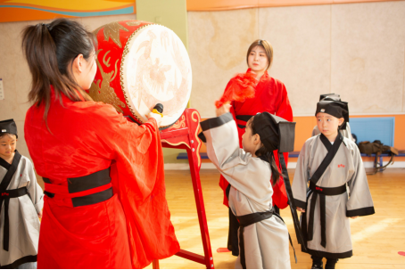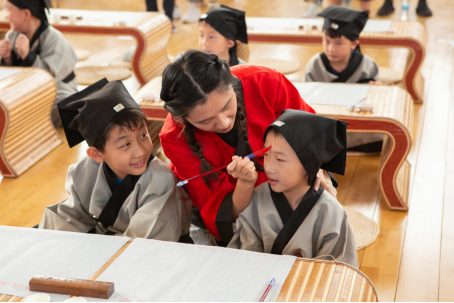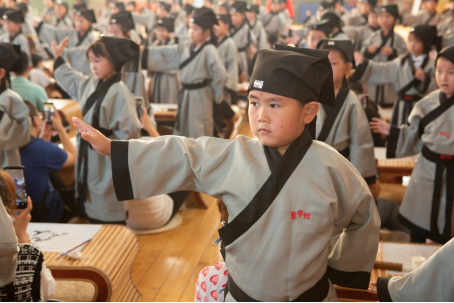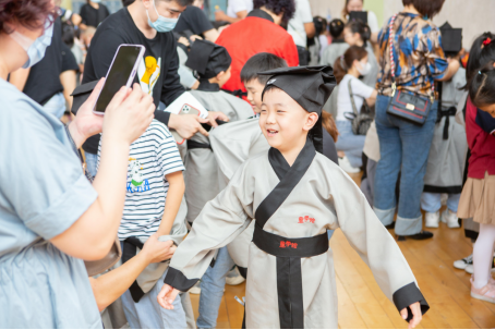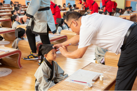 活动伊始,家长给小朋友们穿好衣服,孩子们自正衣冠、互正衣冠后,老师帮他们正衣冠,端正衣冠后的同学们精神百倍。孩子们身首汉服,以一颗至诚感恩之心,向孔子像鞠躬行礼,表示对教师的尊崇。随后,老师们用朱砂在孩子们的额头正中点上红痣,以示开启智慧,从此眼明心亮。接着,孩子们开笔破蒙,书写“人”字,引导孩子们从小写方方正正中国字,做堂堂正正中国人。第五项“击鼓明志”,孩子们在响亮的鼓声中大声喊出自己的梦想。之后,学生在老师们的带领下“净手净心”,希望学生们能在今后的学习中,心无旁骛,保持心灵的洁净。伴随着动人的音乐,孩子们向老师和家长行作揖礼并献上一杯感恩茶,感恩老师们的无私付出,感恩家长们的悉心抚养。最后,小朋友在老师的带领下,齐诵《弟子规》。